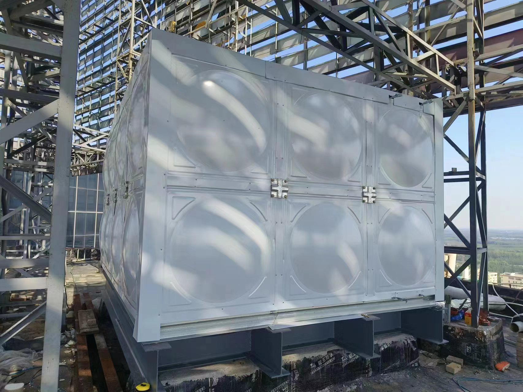 我公司承接的山東德州24立方玻璃鋼保溫水箱已經安裝試水完成,此次水箱安裝在屋頂,用做消防水箱使用。當地冬季溫度較低,防止上凍,在水箱外層采用的是10公分聚氨酯加彩鋼板保溫。