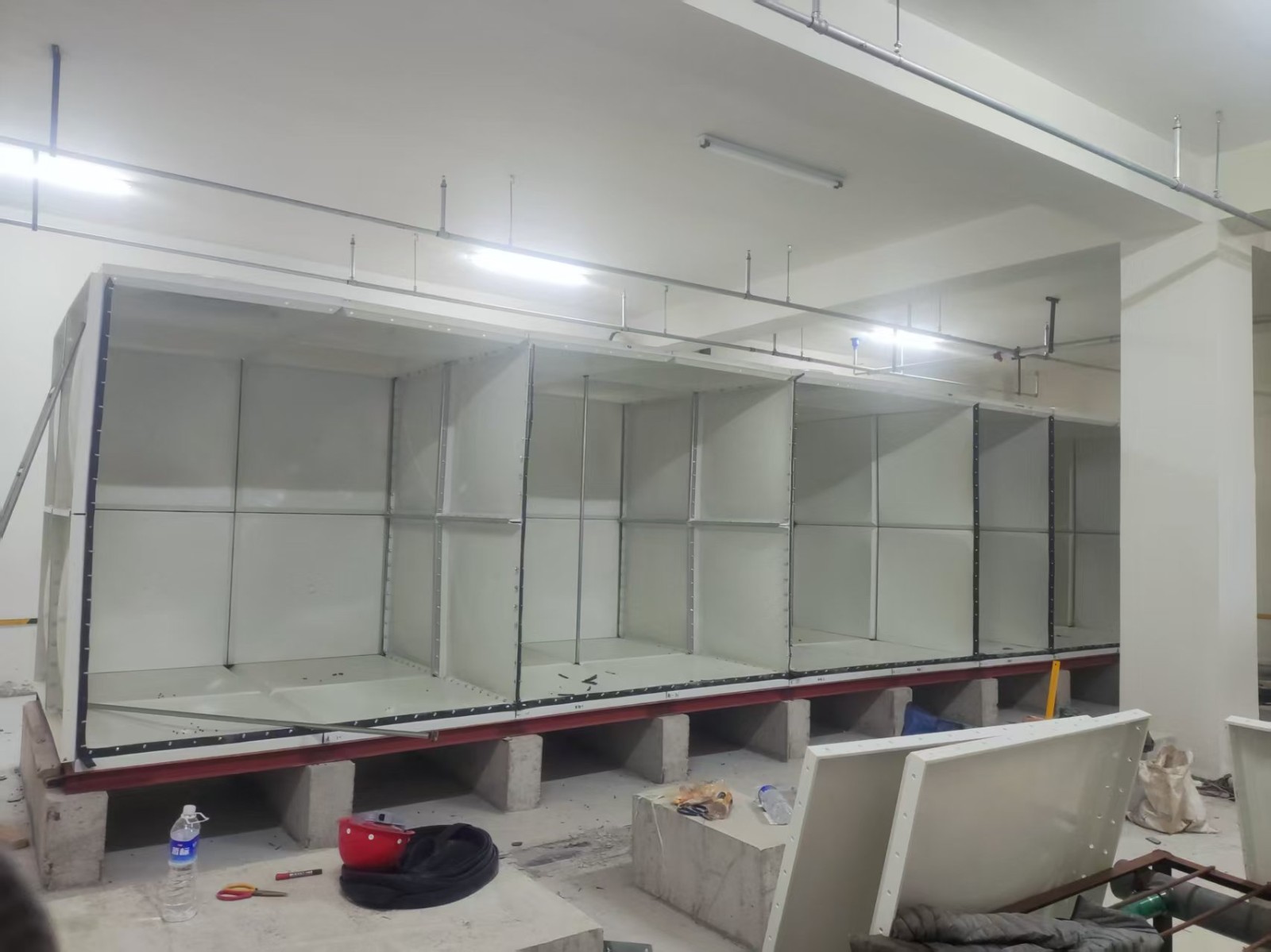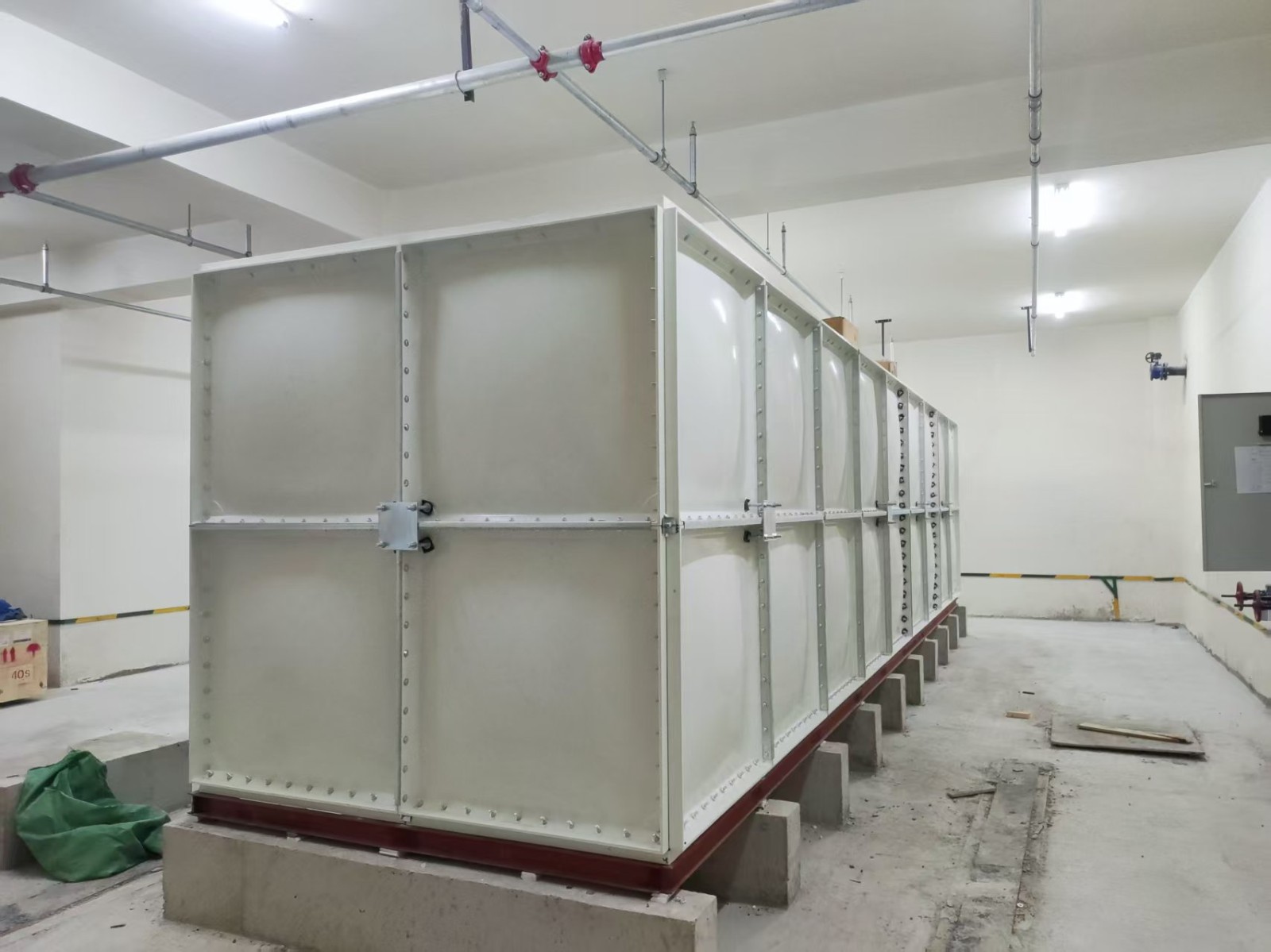 SMC組合式玻璃鋼水箱是一種普遍采用的儲水方式。是由SMC單元板現(xiàn)場組裝而成的一種水箱。單元板用SMC(sheet moulding compound)片材在高溫高壓下模壓成型,水箱內(nèi)采用加強式支撐,其鋼配件選用熱鍍鋅件和不銹鋼件均可。板塊厚度的選取依據(jù)板塊所受的壓力和所處的位置。有5mm、8mm、10mm、12mm、14mm、16mm等。